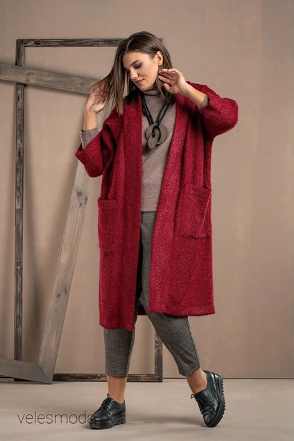 Кардиган- свободного покроя из мягкого трикотажного полотна без застежки. Вырез горловмны и борта оформлены отрезной планкой. Рукава- отрезные на базе цельнокроеных. На передних половинках изделия имеются накладные карманы. Длина спинки-98 см. Длина рукава от линии горловины-57 см.