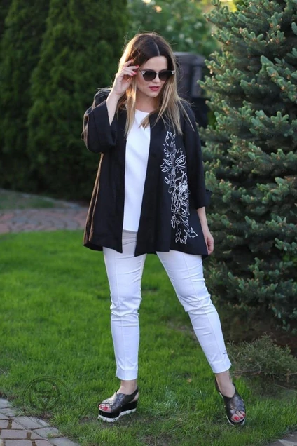 Кардиган женский силуэта трапеция. Вырез горловины V –образный. По левой части переда печать. Спинка со средним швом. Рукав втачной двухшовный. По переду застежкка на пришивную кнопку. Жакет без подкладки. размеры 58 60 62 длина изд. по спинке 85,0 85,0 85,0 ширина спинки 46,0 46,0 46,0 Ширина изделия на уровне глубины пройм 65,0 67,0 69,0 ширина изделия по линии талии 74.0 76.0 78.0 ширина изделия на уровне линии бёдер 86.0 88.0 90.0 ширина изделия внизу 86.0 88.0 90.0 ширина рукава на уровне глубины проймы 22.0 23,0 24.0 длина рукава 53,0 53,0 53,0 Ширина плеча 12.5 12.5 12.5 Ширина рукава внизу 23.0 24.0 25.0