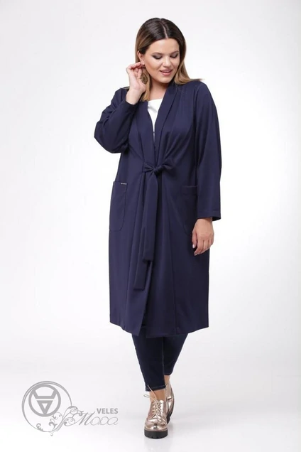Кардиган женский удлиненный прямого силуэта. По переду кардигана рельефы выходящие из плечевого шва и накладные карманы. Центральная часть переда плавно переходящая в воротник. По переду завязки. Спинка со средним швом. Рукав втачной, одношовный с вытачкой в локтевом шве.