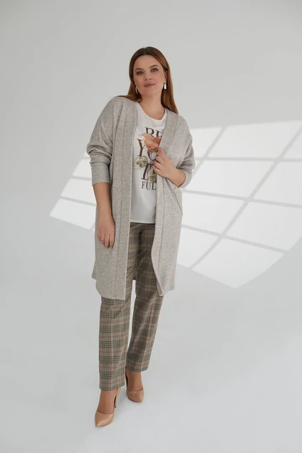 Кардиган из качественной трикотажной ткани. Рукав длинный, спущенный, выполнен из сновной ткани кардигана. По бокам настрочная листочка (имитация карманов). По спинке отрезная кокетка из основной ткани. Длина кардигана по спинке - 97 см.
