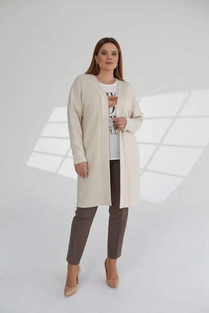 Кардиган из качественной трикотажной ткани. Рукав длинный, спущенный, выполнен из сновной ткани кардигана. По бокам настрочная листочка (имитация карманов). По спинке отрезная кокетка из основной ткани. Длина кардигана по спинке - 97 см.