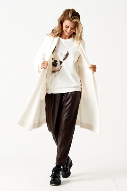 Кардиган женский, свободного силуэта, из трикотажной ткани. Перед с притачной планкой, без застежки. Карманы в боковых швах. Рукав втачной, одношовный. Длина 104 см, рукав 62 см.
