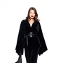 Элегантный черный бархатный кардиган на трикотажной основе и подкладке является идеальным выбором для создания стильного образа. Модель отличается свободным объемом и прямым силуэтом, что придает одежде изысканный и расслабленный вид. Дизайн кардигана включает в себя притачную обтачку по срезам борта и горловины спинки, а также спущенную линию плеч, создающую современный акцент. Рукава кардигана выполнены в стиле "кимоно", широкие и втачные, дополняют образ легкостью и оригинальностью. Комплект дополнен поясом из атласа, который подчеркивает талию и добавляет изделию изысканности.