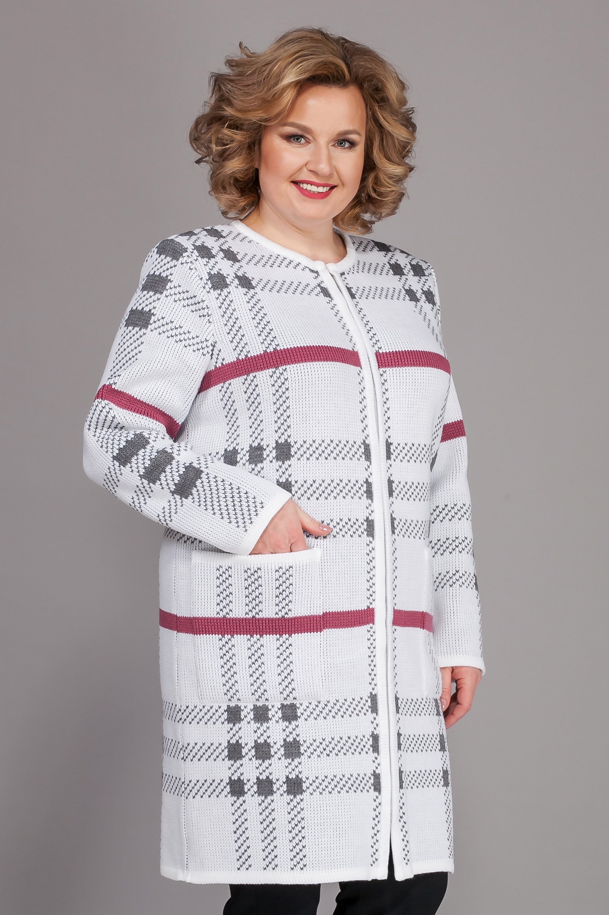 Кардиган-пальто прямого силуэта, без подкладки. Рукава изделия длинные, втачные. Вырез горловины округлой формы, обработан бейкой. Застёжка изделия однобортная, обработана бейкой и на молнии. По переду накладные карманы. В качестве отделки изделия служит геометрический рисунок контрастных цветов, основной цвет белый. Переплетение- жаккард. Замеры 54р: полуобхват по груди - 56 см, полуобхват бедер-57 см; длина рукава -60 см, ширина рукава- 36 см. Длина изделия- 87 см