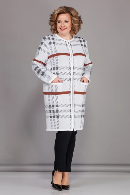 Кардиган-пальто прямого силуэта, без подкладки. Рукава изделия длинные, втачные. Вырез горловины округлой формы, обработан бейкой. Застёжка изделия однобортная, обработана бейкой и на молнии. По переду накладные карманы. В качестве отделки изделия служит геометрический рисунок контрастных цветов, основной цвет белый. Переплетение- жаккард. Замеры 54р: полуобхват по груди - 56 см, полуобхват бедер-57 см; длина рукава -60 см, ширина рукава- 36 см. Длина изделия- 87 см