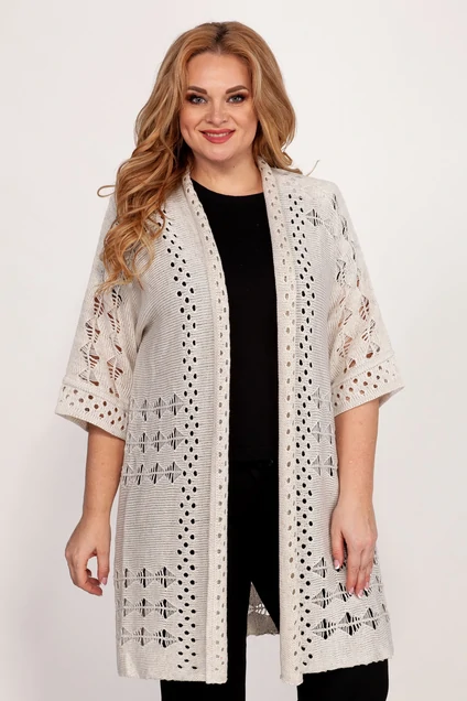 Кардиган женский, ажурный вязанный трикотаж, прямого силуэта,без застёжки. Рукава цельнокроеныые 3/4. Воротник также цельнокроеный. В качестве отделки по переду, рукавам и спинке выполнена деккеровка, что придаёт изделию нарядность. Длина изделия по спинке 50р -81см; 56р -82см;60р-83см. Длина рукава от горловины-51см.