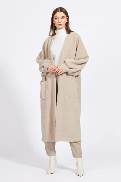 Кардиган выполнен из трикотажного полотна. Кардиган прямого силуэта, длиной миди. Карманы накладные. Спинка цельная. Плечевой шов спущен. Рукав покроя "кимоно", расширенный к низу и присборенный на манжет.