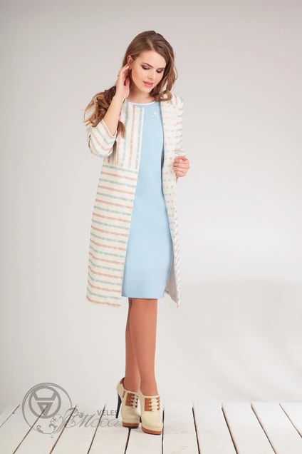 Кардиган с центральной застежкой на пришивные кнопки, без воротника, с круглым вырезом горловины. Кардиган отрезной по линии талии. В боковых швах расположены карманы. Верхняя часть переда и спинки с талиевыми вытачками. Силуэт: полуприлегающий Вид покроя рукава: втачной, 7/8, двухшовный. Цветовая гамма для верха, подкладки, фурнитуры, отделки: кардиган из жаккардовой ткани с рисунком. Тип ткани: текстильный, костюмно - платьевый