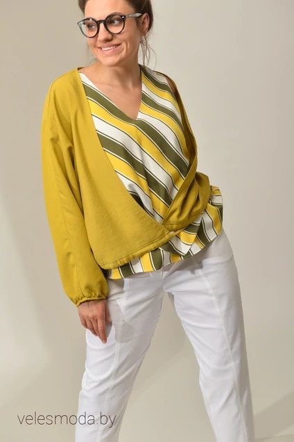 Жакет-накидка свободный укороченный с цельнокроенным рукавом. Рукав длинный, низ рукава на резинке. Жакет легкий на запах. По низу изделия кулиса с втягивающимся шнуром из основной ткани.