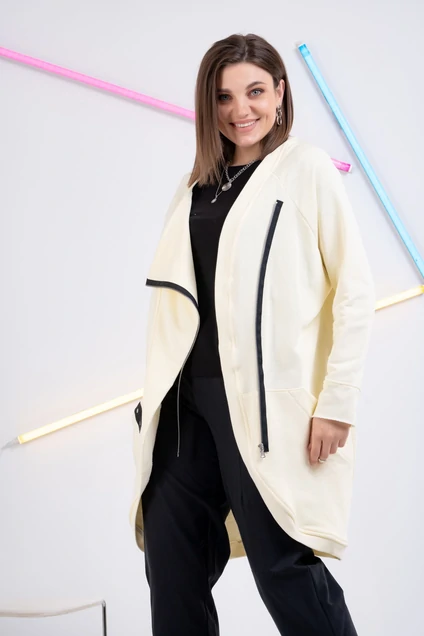 Хит трикотажных изделий от бренда GRATTO – кардиган, выполнен из трикотажного полотна на хлопковой основе. Универсальная женская одежда: для любого возраста и комплекции, скрывает нюансы фигуры, может дополнить любой комплект, прекрасно подойдет к платью, брюкам, юбке. "Изюминка" данного изделия - закругленный низ на обтачке, диагональная застёжка на молнии не обработанная до конца, накладные фигурные карманы. Горловина без воротника на эластичной обтачке. Длинный рукав реглан, заканчивающийся манжетой с необработанными краями. На правом кармане декоративный элемент. Особое очарование придает декоративная тесьма по спинке с декоративным элементом «полукольцо». Модель выполнена в размерах plus-size (плюс-сайз). Наше изделие: - не красится; - не теряет форму после стирки