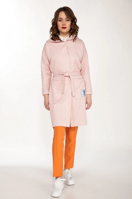 Кардиган женский выполнен из плотного структурного трикотажа прямого силуэта с капюшоном на подкладке, центрально- бортовая застежка на кнопках, на полочках накладные карманы, рукав спущенный втачной с манжетом, пояс съемный. Длина кардигана 92 см.