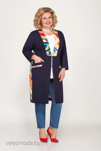 Кардиган женский, зауженный к низу, со спушенной линией плеча и центральной бортовой застежкой на 2 крючка. Спереди накладные карманы. Вставка по горловине имитирует воротник. Боковой шов спинки смещен на перед. Спинка со средним швом. Рукав одношовный, длиной 7/8, с возможностью заворачивания манжеты. Горловина V-образной формы. Кардиган без подкладки.