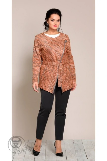 Кардиган из трикотажного полотна прямого силуэта с поясом , кожанной отделкой по полочки и карманам с застежкой на пуговицу. Длина изделия 72,5см - 50-52рр, , 74,5см - 54-56рр., 76,5см - 58р рукав 62,5см.