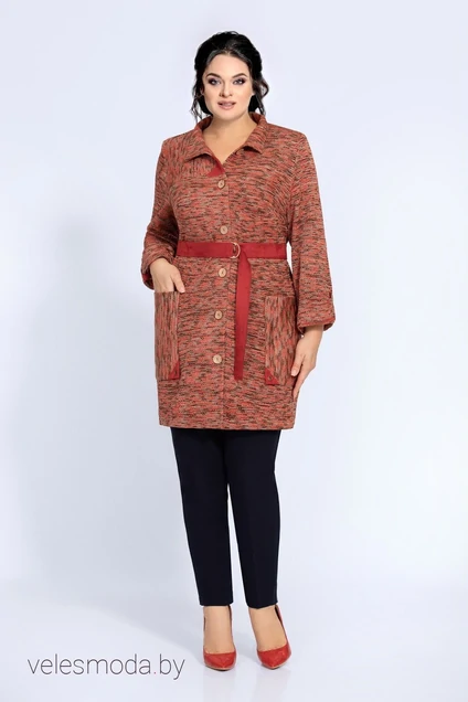 Кардиган из трикотажного полотна прямого силуэта , с отделкой из замши , с накладными карманами ,с застежкой на пуговицы по центру, с асимметричной кокеткой в правой части полочки, с воротником-стойкой. Рукав втачной с манжетой и патой из замши. Спинка на кокетке в верхней части. Пояс из замши с застежкой на 2 полукольца. длина 85см. ширина на уровне глубины проймы 61,5 63,5 65,5см (58,60,62рр) , ширина по талии 62,64,66 см соответственно , ширина на уровне бедер 65,5 67,5 69,5см. Длина рукава 60см ., ширина на уровне проймы40,5 41,42см. трикотаж