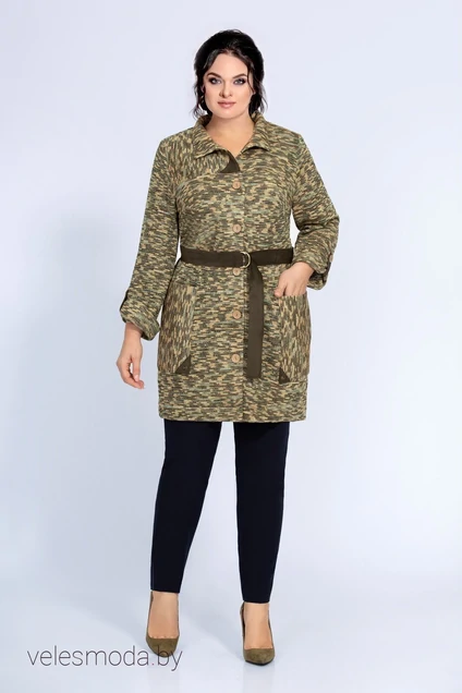 Кардиган из трикотажного полотна прямого силуэта , с отделкой из замши , с накладными карманами ,с застежкой на пуговицы по центру, с асимметричной кокеткой в правой части полочки, с воротником-стойкой. Рукав втачной с манжетой и патой из замши. Спинка на кокетке в верхней части. Пояс из замши с застежкой на 2 полукольца. длина 85см. ширина на уровне глубины проймы 61,5 63,5 65,5см (58,60,62рр) , ширина по талии 62,64,66 см соответственно , ширина на уровне бедер 65,5 67,5 69,5см. Длина рукава 60см ., ширина на уровне проймы40,5 41,42см. трикотаж