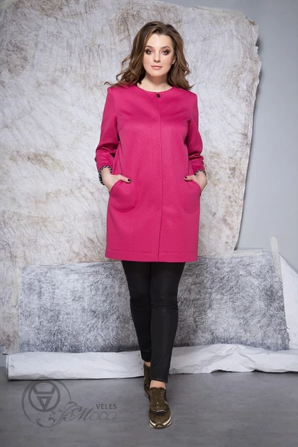 Трикотажное полотно (неопрен). Модное полупальто прямого силуэта, поможет добавить ярких красок и приблизить долгожданную весну. Полупальто длиной до середины бедра, с центральной бортовой застежкой на пришивные кнопки. Перед с нагрудными вытачками и карманами. Подзор кармана из отделочной ткани. Горловина округлой формы. Рукава втачные, длиной 7/8. По низу рукавов притачной кант из отделочной ткани. Длина по спинке – 87,0см (48-50см), 89,0см (52-54р) Длина рукава – 51,0см