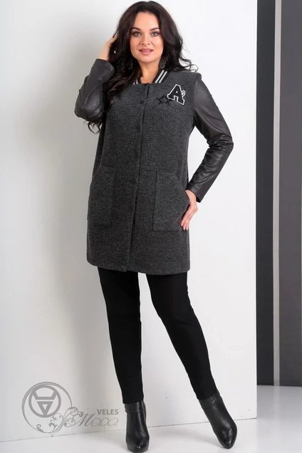 Кардиган прямого силуэта из костюмной ткани. По переду нагрудные вытачки и накладные карманы с кожаными рамками. По спинке средний шов. Рукава и горловина из довяза. Застежка на кнопки. Кардиган без подкладки. Длина спинки - 85 см, рукава - 63 см.