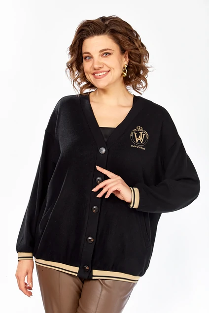 Кардиган женский, изготовлен из трикотажного полотна. Горловина V-образной формы, застежка отрезная планка на петли и пуговицы. Карманы с листочками. По низу изделия и низу рукавов-декоративные довязы. Спинка цельнокроенная. Рукава спущенные длинные. Отделочный элемент — вышивка на детали переда.