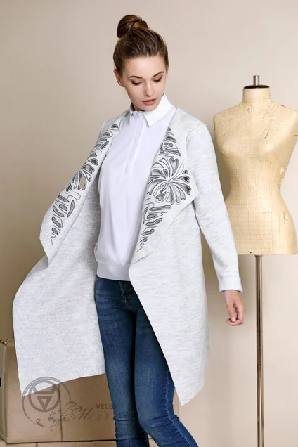 Кардиган свободного кроя без застежки с ассиметричной длиной, отлетные лацканы декоррированы вышивкой с перфорацией. Длина по спинке 76, по переду 82, длина рукава 63.