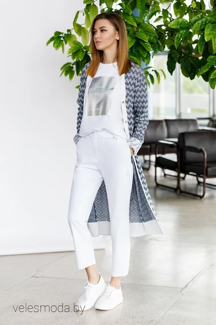 Кардиган свободного кроя из вязанного трикотажного полотна, со спущенной линией плеча. По переду планка из контрастной ткани с застежкой на пришивные кнопки. Рукав длинный с отложной манжетой декорированной авторским принтом. В боковых швах разрезы, низ на обтачке из ткани-компаньона. На спинке декоративная авторская нашивка. Длина 117 см, рукав 66 см.