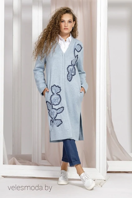 Кардиган свободного кроя из трикотажного полотна, со спущенной линией плеча. По переду планка с застежкой на пришивные кнопки. Рукав длинный с отложной манжетой. В боковых швах функциональные карманы. Низ на обтачке, в боковых швах разрезы. По передним полочкам декорирован авторской вышивкой. Длина 111 см, рукав 60 см.
