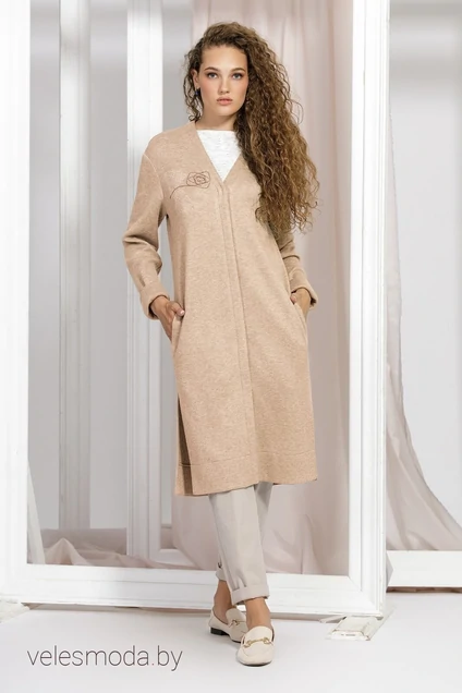 Кардиган свободного кроя из трикотажного полотна, со спущенной линией плеча. По переду планка с застежкой на пришивные кнопки. Рукав длинный с отложной манжетой. В боковых швах функциональные карманы. Низ на обтачке, в боковых швах разрезы. По передней полочке и спинке декорирован авторской вышивкой. Длина 11 см, рукав 60 см.