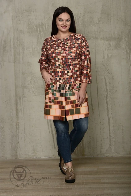 Кардиган женский из трикотажного полотна. Кардиган прямого силуэта со спущенной линией плеча. Застежку на петли-пуговицы. Рукав 3/4. На правой полочке накладной карман, в боковых швах разрезы. Длина кардигана 90, длина рукава 50.
