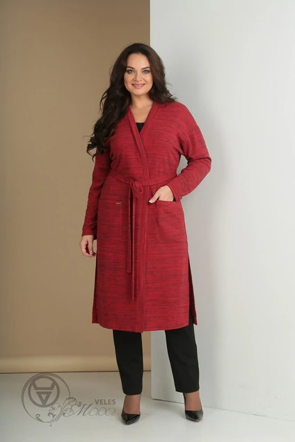 Кардиган женский, прямого силуэта, без подкладки, с накладными карманами и высокими разрезами по боковым швам. Не имеет застежки, в талии его можно перехватить поясом из той же ткани. Длина спинки - 112см Длина рукава от горловины - 72см