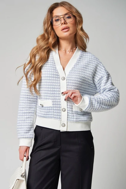 Застежка центральная на петли и пуговицы. На деталях переда накладные карманы с притачными планками, на которые прикреплены декоративные пуговицы. Рукава втачные одношовные длинные, с притачными манжетами. Линия плеча спущена. По низу кардигана, по краю борта и горловине - притачная планка.