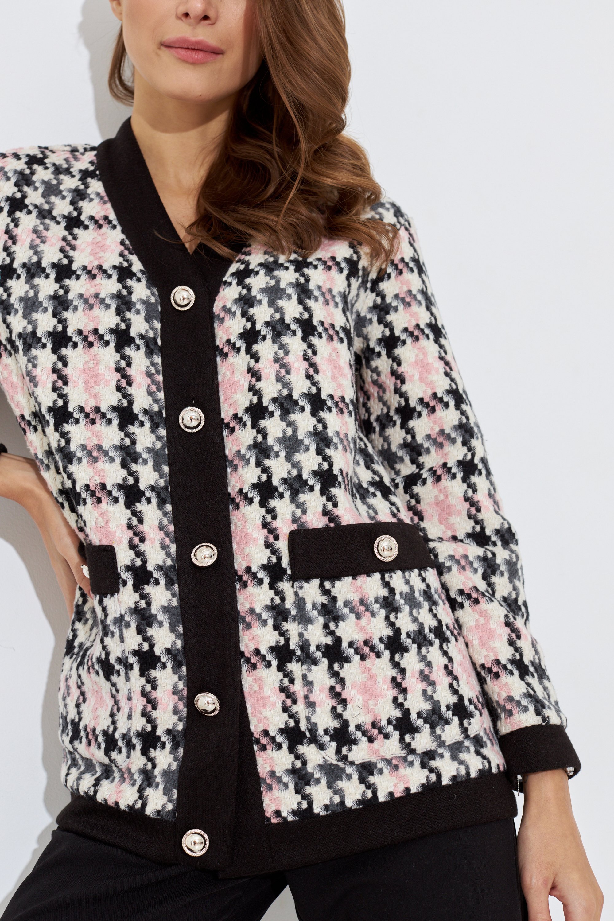 Удлиненный кардиган гладкой вязки выполнен из жакарда с принтом пье-де-пуль. Глубокий V-вырез окантован черной планкой, продленной в застежку на пуговицы.