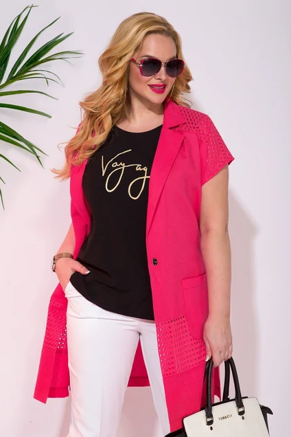 Стильный комплект, состоящий из льняного кардигана с хлопковой вышивкой «ришелье» и топа. Кардиган прямого силуэта, со спущенной линией плеча. Застежка с подбортом на потайную кнопку. Горловина с отложным воротником. Полочку украшает кокетка и вставки из декоративного хлопка. Карманы в изделии накладные, рабочие. По бокам расположены разрезы. Спинка с кружевной кокеткой, по центру заложена бантовая складка. В комплекте съёмный пояс с металлической пряжкой. Топ с округлым вырезом горловины из вискозы, без рукавов. По полочке расположена декоративная печать (Voyaj –фр.Путишествие). Такой комплект отлично сочетается с однотонными брюками из базовой коллекции от «LILIANA», либо джинсами; незаменим в сезоне весна-лето 2023! Длина кардигана по спинке – 92 см.