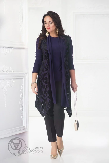 Оригинальная модель, состоящая из трикотажного топа и удлиненного кардигана.Топ приталенного силуэта, с округлым вырезом горловины; с втачным длинным рукавом. Кардиган свободного покроя, выполнен из эффектного жакарда с эффектом бархата. Модель без застежки, встык. Горловина ниспадающий «апаш». Низ кардигана ассиметричный формы. Такая эффектная модель хорошо сочетается с юбками, брюками и леггинсасми; благодаря сидуэту отлично скрывает недостатки, подчеркивая Ваши достоинства. Примечание: модель хорошо растяжима. Кардиган по спинке – 92 см. Топ – 70 см. Рука в топа – 62 см.