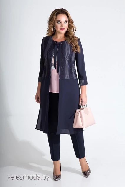 Лаконичный комплект в романтическом стиле, выполнен из жаккардовой полоски с добавлением креп-шифона. Удлиненный кардиган, прямого силуэта, с застежкой встык. Модель отрезная по талии, со струящимся низом из креп-шифона. По бокам расположены разрезы. Рукав втачной, ¾-ти с притачным манжетом. Полочку украшают декоративные люверсы с завязкой на шифоновую ленту-бант. В комплекте топ, приталенного силуэта из креп-шифона. Модель с декоративной печатью. По бокам расположены разрезы. Модель без рукавов! Отлично сочетается с однотонными брючками из базовой коллекции «Liliana». Топ 65; Кардиган – 102 см, рукав - 47 см.