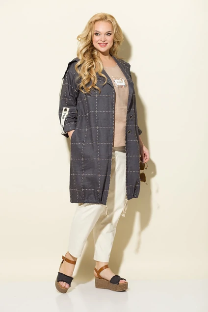 Европейский шик! Стильная модель льняного кардигана-пыльника в цвете антрацит – 100 % must have этой весны! Натуральная льняная ткань с прошитой хлопковой нитью. Свободный удлиненный силуэт со спущенной линией плеча. В боковых швах расположены карманы. Воротник свободный «Апаж», с декоративной шнуровкой. Рукав длинный, с декоративной патой из ленты с печатью; может фиксироваться на длину ¾-ти. Застежка – на навесные петли и пуговицы. Низ изделия присборен на кулиску. Длина по спинке – 100см, рукав – около 63 см.