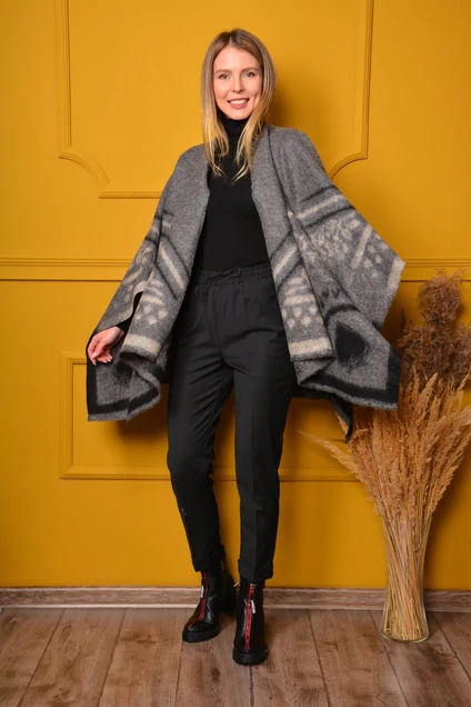 Пончо считаются отличной альтернативой кардигану или пуловеру. Особенностью пончо считается свободный крой, подразумевающий удобство и комфорт в ношении. С его помощью легко корректируется фигура, подчеркиваются достоинства и скрываются недостатки. Данная модель представляет собой прямоугольник 122см*150см из шерстяного материала типа вареная шерсть.