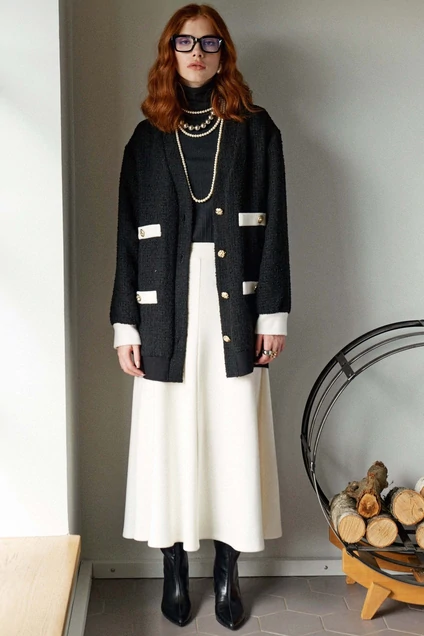 Кардиган выполнен из ткани рогожка на трикотажной подкладке. Линия плеча спущена, по низу рукава притачная манжета из отделочного трикотажного полотна. У-образный вырез горловины, по переду планка из отделочной ткани, застёжка центральная на петли и пуговицы. По бокам прорезные не функциональные карманы. По низу кардигана вставлен довяз.