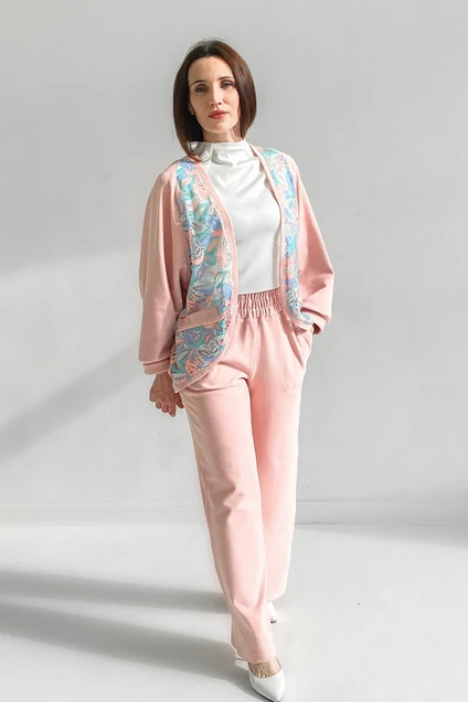 Стильный и нарядный, женский кардиган из мягкого трикотажа, свободного кроя, подчеркнет вашу женственность. Изделие без застежки с широким рукавом. По переду вставки из цветного кружева, с имитацией кармана "листочка". Незаменим в прохладою и переменчивую погоду.