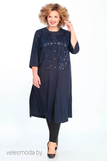 Кардиган женский, прямого силуэта, отрезной на полочке по линии бедер. Верхняя передняя часть выполнена из сетки с вышивкой. Застежка центральная на петли-пуговицы, с планкой. Нагрудные вытачки. Горловина круглая, обработана отрезной планкой. Рукав втачной, одношовный 3/4. Спинка с отрезной кокеткой. По спинке сборка. Боковые швы с высокими разрезами.
