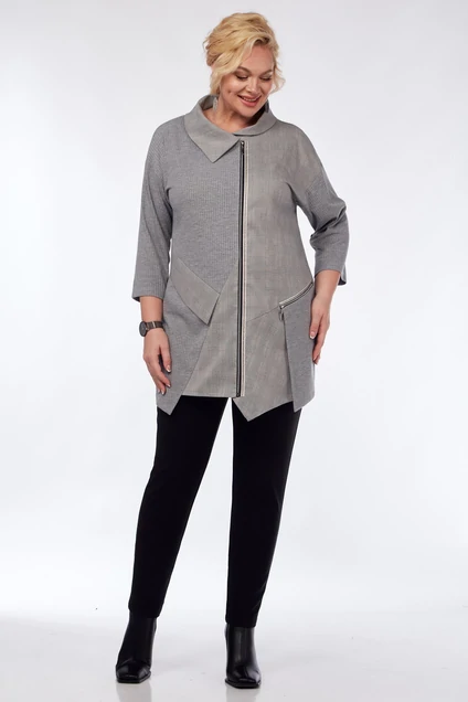 Кардиган женский, прямого силуэта. Скомбинирован из ткани в клетку и трикотажа резинка, с ассимметричным низом. Застежка ассиметричная на молнию. На левой полочке обработан атлетной карман из отделочной ткани, застегивающийся на молнию. Рукав рубашечный 3/4. Воротник стояче-отложной, ассиметричный. Отделкой служит декоративная тесьма настроченная по молнии и по верху кармана.