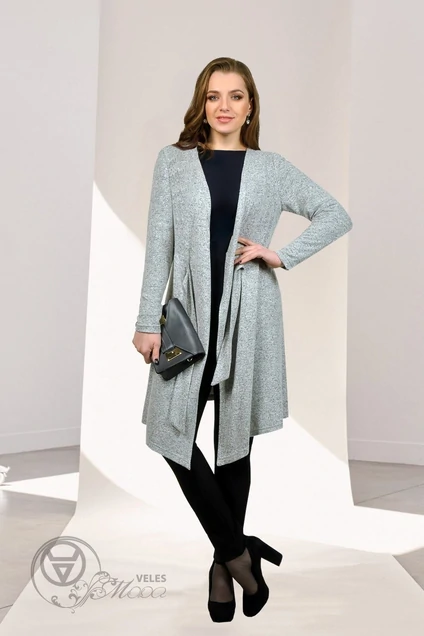 Силуэт кардигана полуприлегающий, рукав втрачной , длина рукава - 62см, длина по спинке - 90 см. По спинке средний шов с нашивкой. По переду фигурные рельефы, застежка на завязки. Перед удлиненный. По левому боковому шву нашивка.