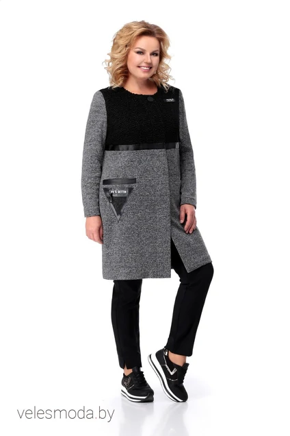 Кардиган прямого силуэта,частично на подкладке до пояса. Кокетка спинки и полочки из отделочного материала под каракуль подчеркнута вставками под кожу. Карманы прорезные с листочкой.На кармане и полочке пришивные украшения.Длина по спинке-90см. Рукав втачной, одношовный. Длина рукава-62см.