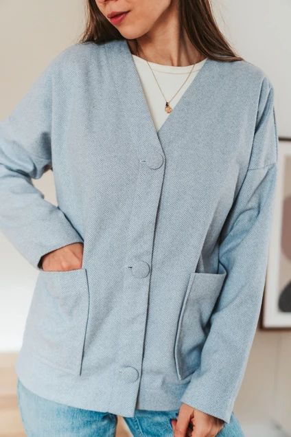 Кардиган свободного кроя со спущенной линией плеча, застёгивается на 3 петли и декоративные обтянутые пуговицы. По переду расположены удобные накладные карманы .
