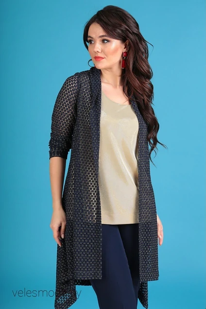 Кардиган - элемент базового гардероба, рассчитанный не на один сезон. Кардиган выполнен из трикотажного полотна ажурной вязки с люрексом. Кардиган спереди расширенного силуэта, спинка прямая. Рукав втачной одношовный. Кардиган без застежки.