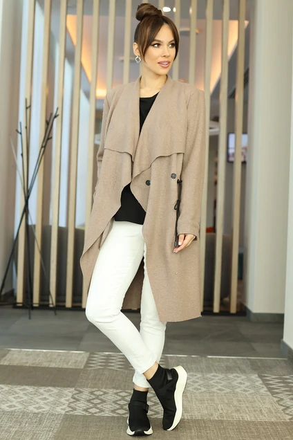 Уютный кардиган идеально подойдет для прогулок осенними вечерами. Свободный крой. Спинка со средним швом и талиевыми вытачками. Перед со свободно ниспадающим воротником мягкой формы. По талии кулиска с отделочным шнуром. Рукава втачные, двухшовные, на подкладке. Прорезные карманы с листочками. Застежка на две декоративные кнопки
