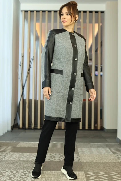 Кардиган в спортивном стиле. Удобное решение на каждый день. Выполнен из пальтовой ткани с добавлением натуральной шерсти, в сочетании с экокожей. Полочка с рельефами, накладными карманами и отрезной кокеткой. Спинка со средним швом и рельефами. Низ изделия с притачной планкой. Рукав втачной по низу с притачной манжетой, по среднему шву рукава настрочена тесьма. Застежка центральная на молнию с притачной планкой, которая застегивается на петли пуговицы.