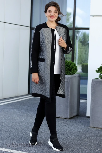 Кардиган в спортивном стиле. Удобное решение на каждый день. Выполнен из материала на синтепоне в сочетании с трикотажным полотном. Полочка с рельефами, накладными карманами и отрезной кокеткой. Спинка со средним швом и рельефами. Низ изделия с притачной планкой. Рукав втачной двухшовный с притачной манжетой. Застежка центральная на молнию. Рукава и центральная планка переда декорированы черно-белой тесьмой в сочетании с пуговицами.