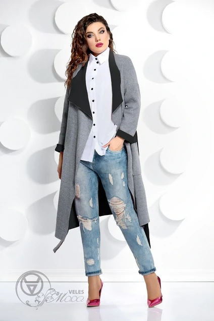 Кардиган женский прямого силуэта со спущенным плечом, без подкладки. Выполнен из двухсторонней пальтовой ткани (не тянется). По переду – потайные карманы и пояс, протянутый по талии. Длина кардигана – 103 см. Длина рукава – 62 см. Ширина рукава в пройме – 38 см.