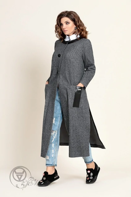 Кардиган женский полуприлегающего силуэта без подкладки. Выполнен из трикотажного полотна (тянется) в сочетании с искусственной кожей (тянется). По боковым швам обработаны длинные разрезы, по полочкам накладные карманы. Длина кардигана – 123 см. Длина рукава – 61 см. Ширина рукава в пройме – 44 см.