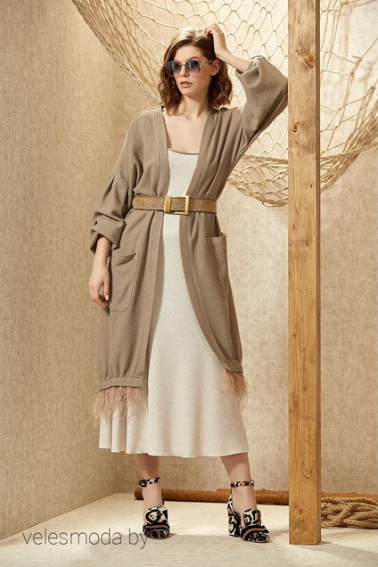 Ремень входит в комплект. Кардиган прямого силуэта длиной ниже линии колена. Изделие без застежки, с накладными карманами и глубокой линией проймы. Рукав спущенный, комбинированный. Низ рукава заканчивается притачной манжетой. Спинка со средним швом. Отделка - декоративная тесьма - перья (отстегиваются, на кнопках)по линии низа.