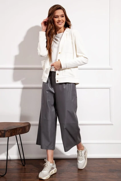 Уютный кардиган выполнен из трикотажа прямого силуэта с воротником и отложными лацканами и застежкой на пуговицы. По переду обработаны накладные карманы. Низ рукавов и изделия на притачной планке. Изделие без подкладки.